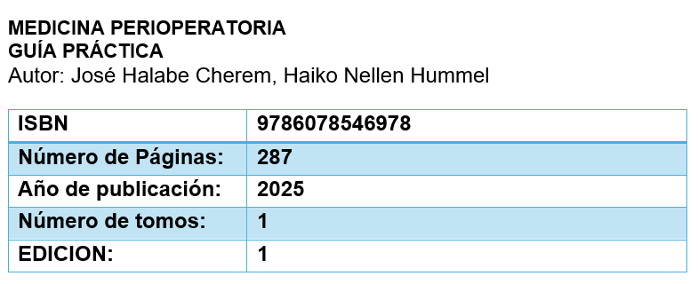 - Cada uno de los capítulos está actualizado y es de lectura ágil y didáctica. Se complementan con tablas y figuras que ayudan puntualmente al mejor entendimiento del texto y complementan la calidad educativa de los capítulos. Estoy seguro de que este libro será una lectura obligada para el personal de salud involucrado en la medicina perioperatoria, de la que la evaluación preoperatoria es uno de sus pilares.